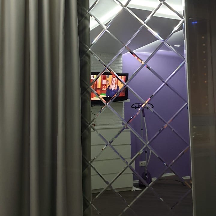 Использовалась серебристая зеркальная плитка формы "вытянутый ромб".